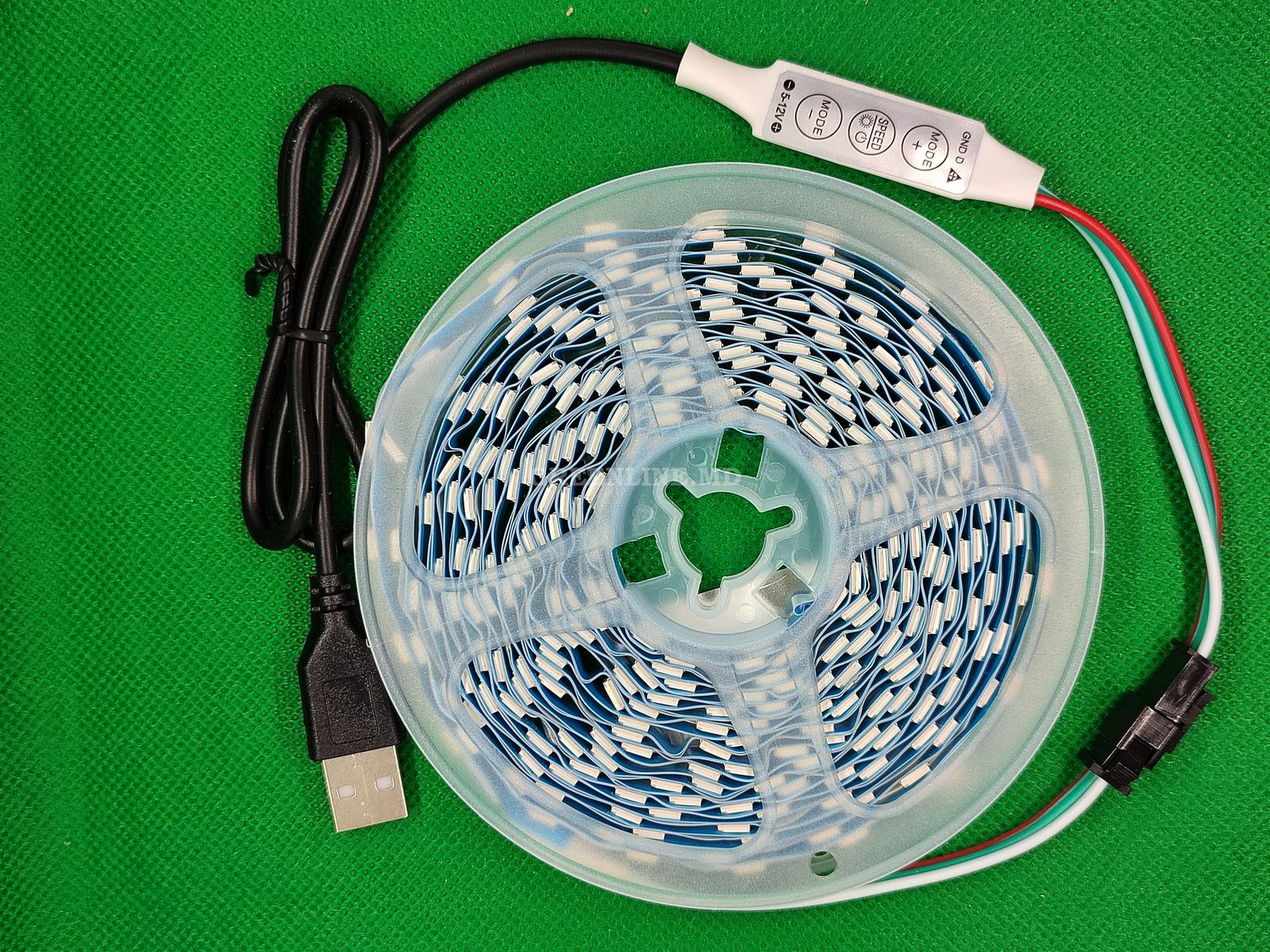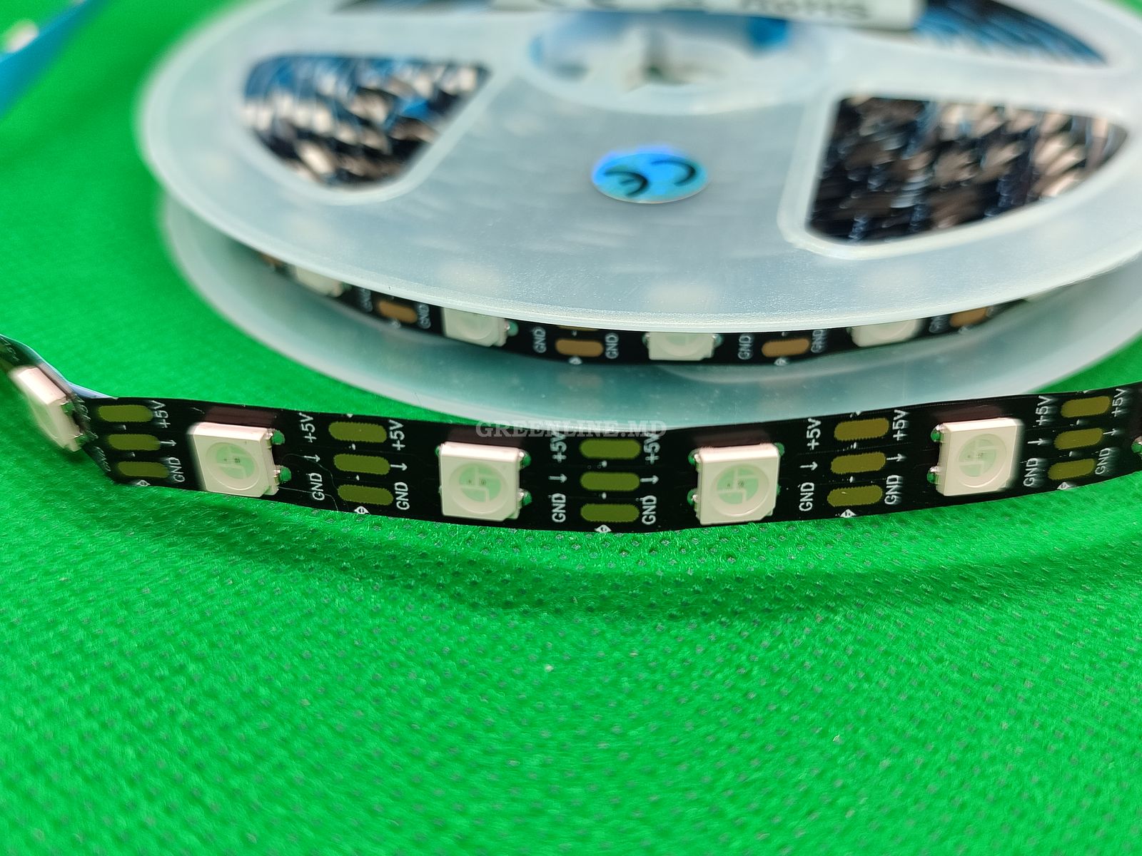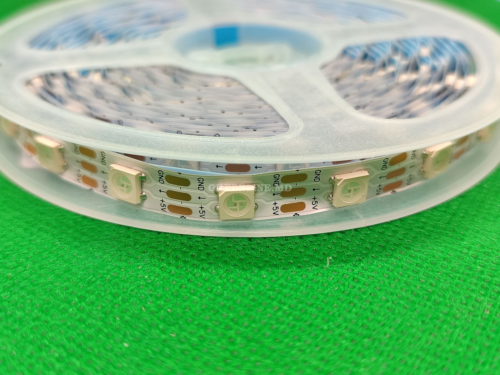 Bandă LED RGB adresabilă (bandă RGB SMART) bazată pe LED-uri RGB WS2812B în capsule SMD 5050. Benzile SMART diferă de benzile LED RGB standard prin faptul că fiecare LED poate fi controlat independent. Aceasta înseamnă că puteți, de exemplu, să faceți unele LED-uri albastre, altele verzi, altele albe sau să opriți complet unele.